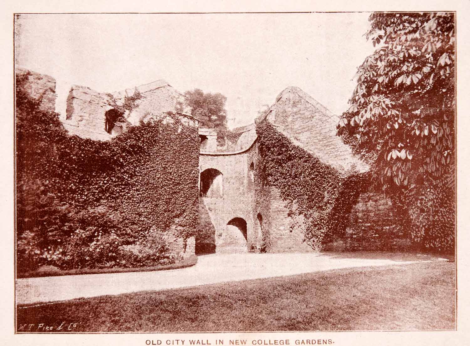 This is an original 1900 duotone halftone print of the old city wall in the gardens of New College at Oxford, England. Officially, the college's name is the College of St. Mary, however as there was another college of that name it simply become New College. The city wall was originally part of the medieval fortifications of Oxford town.