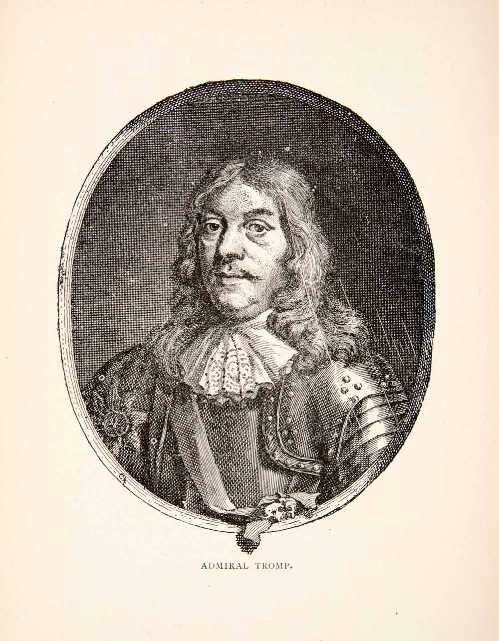 This is an original 1900 black and white relief line-block print portrait of the Dutch Admiral Maarten Tromp.