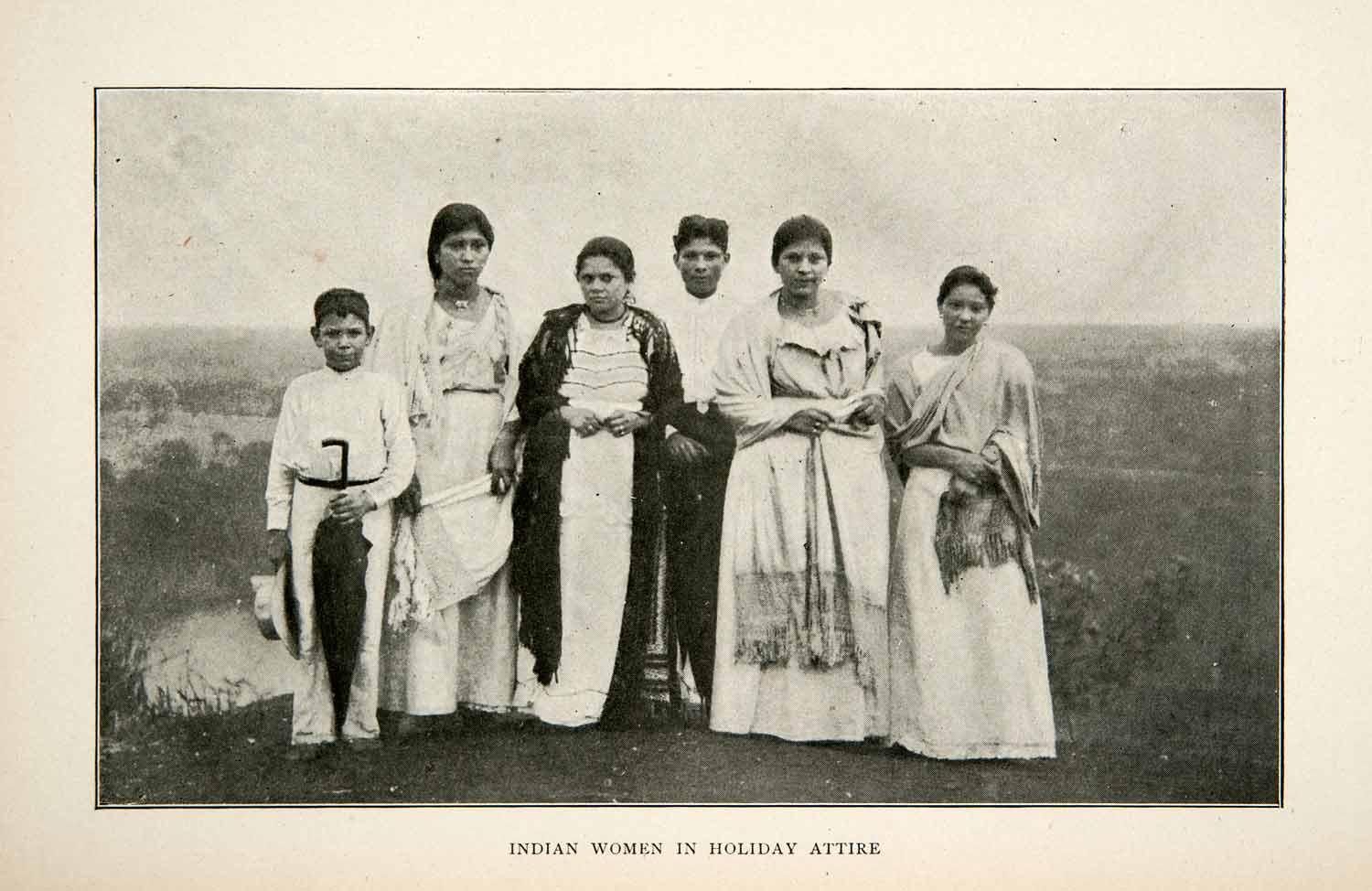 This is an original 1900 black and white halftone print portrait of some Native American women in their holiday attire, as well as one man and one boy.