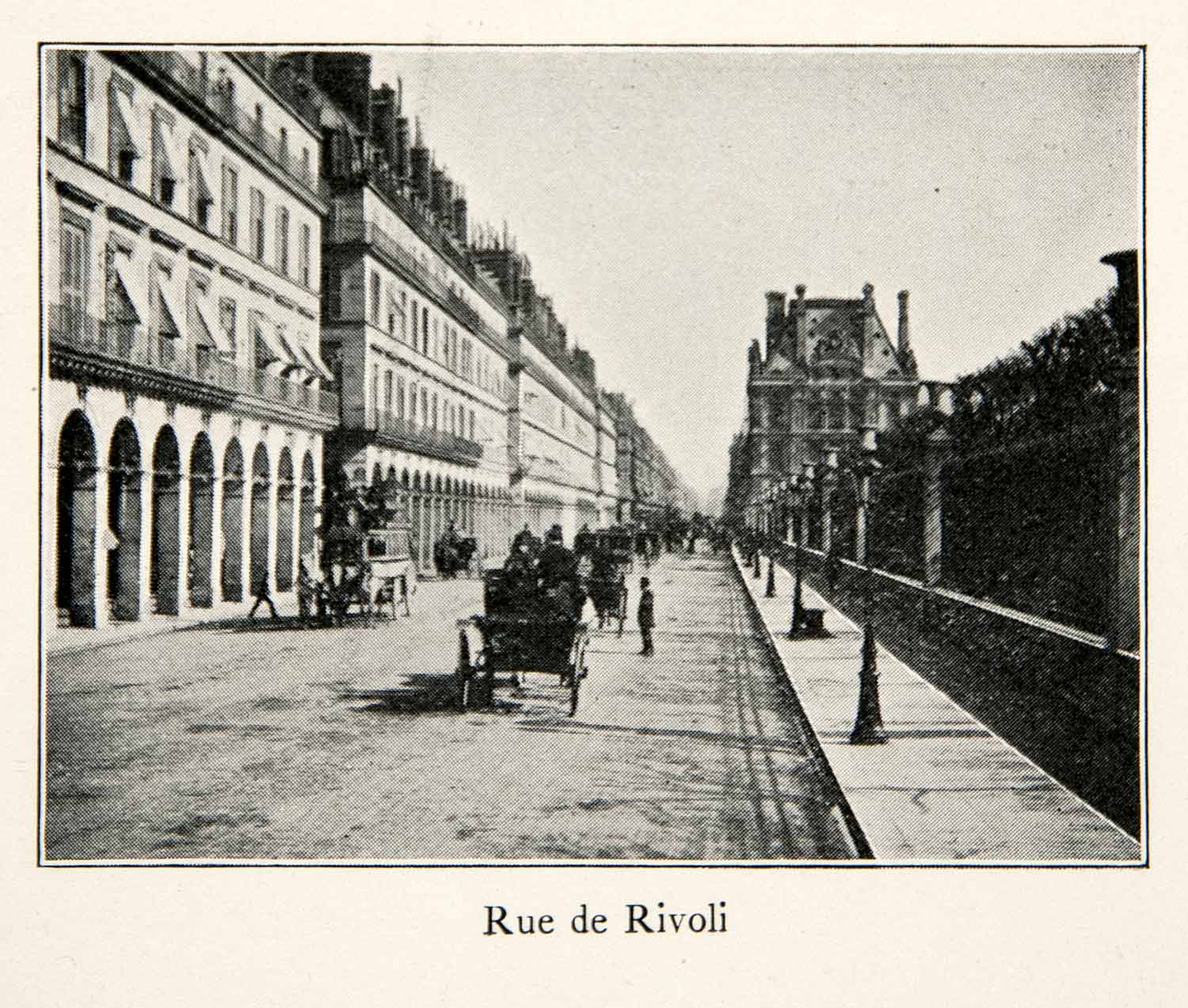 This is an original 1900 black and white halftone print of the "Rue de la Rivoli," in Paris, France.