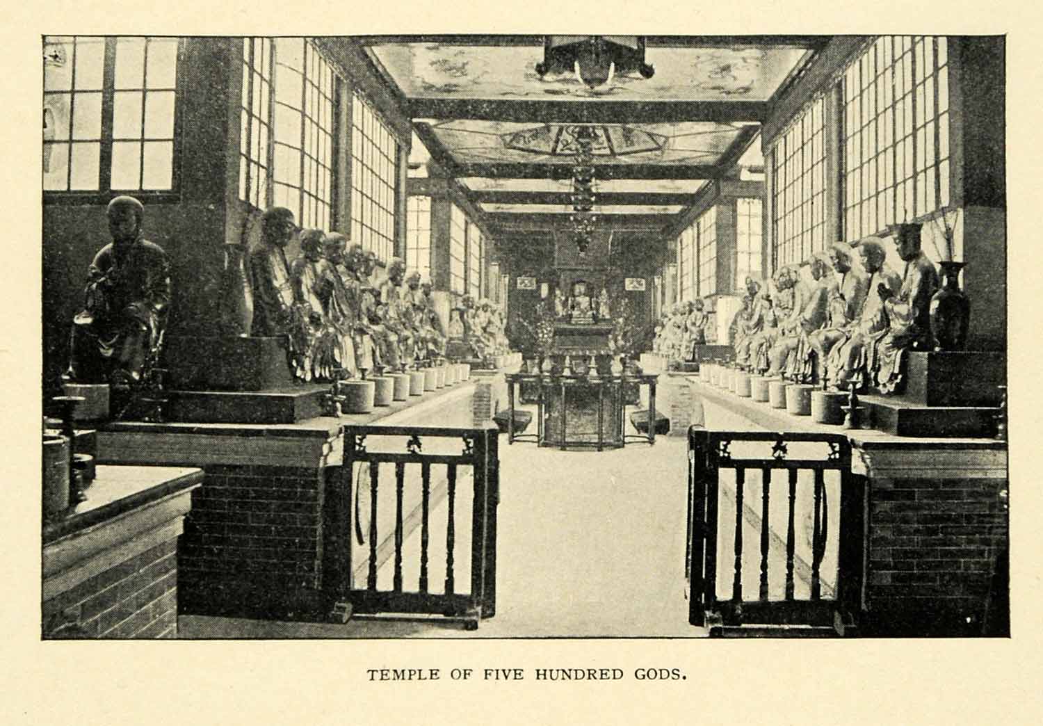 This is an original 1900 halftone print of the Temple of 500 Gods which is named because within its walls are seated five hundred life-size images of gilded wood, representing deified sages of Buddhist faith. They are all coarse specimens of sculpture and many are amusing caricatures. In front of each is a small jar of ashes, in which the worshiper burns a stick of incense in honor of his favorite god.