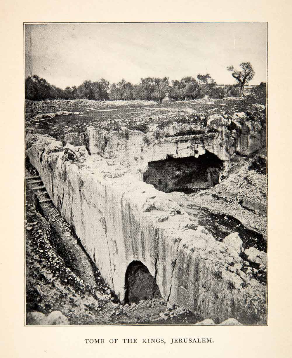 This is an original 1900 black and white halftone print that depicts the Tomb of the Kings in Jerusalem, Israel.
