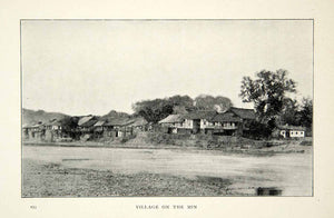 This is an original 1900 black and white halftone print of a village along the banks of the Min River, China.
