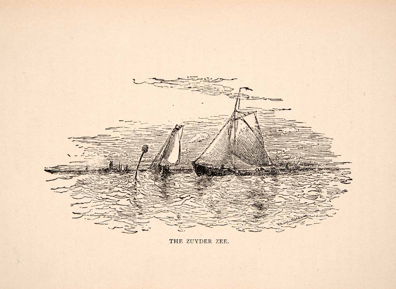 This is an original 1900 black and white relief line-block print of the Zuiderzee, a shallow bay northwest of the Netherlands.