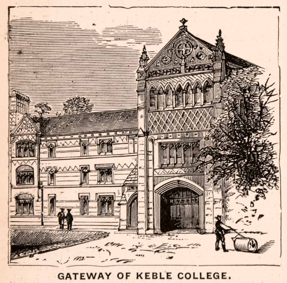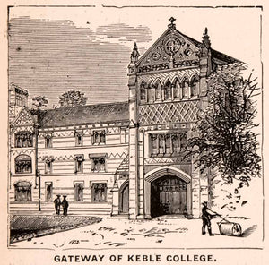 This is an original 1900 black and white wood engraving of a man using a lawn roller outside the gateway to Keble College, a constituent of Oxford University located in Oxford, England. The main building were designed by William Butterfield as red brick Victorian Gothic, which distinguishes them from others at the Oxford campus. Please note the dimensions of this image.