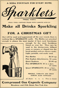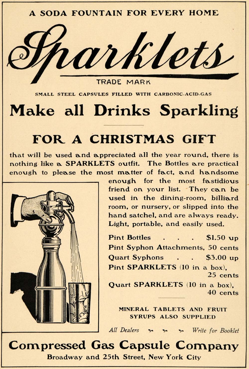 This is an original 1901 black and white print ad for the Compressed Gas Capsule Company, located at Broadway and 25th Street in New York City. This ad features their Sparklets small steel capsules filled with carbonic-acid-gas for carbonated drinks and beverages.