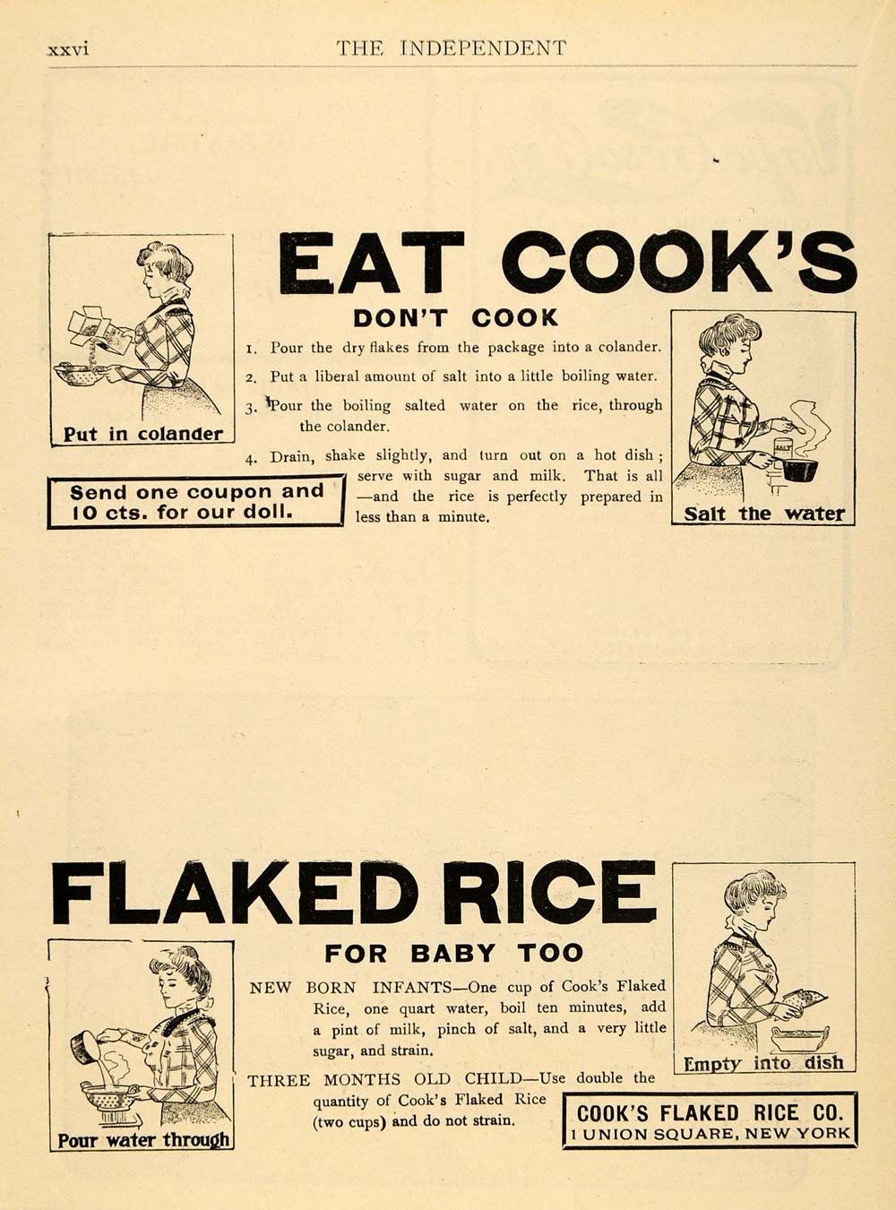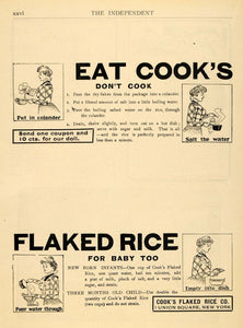 This is an original 1901 black and white print ad for Cook's Flaked Rice Company of 1 Union Square, New York. The ad uses the caption, "Eat Cook's-- Don't Cook."