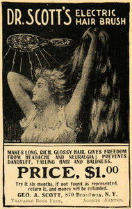 This is an original 1901 black and white print ad for Dr. Scott's Electric Hair Brush from George A. Scott of 870 Broadway, New York.