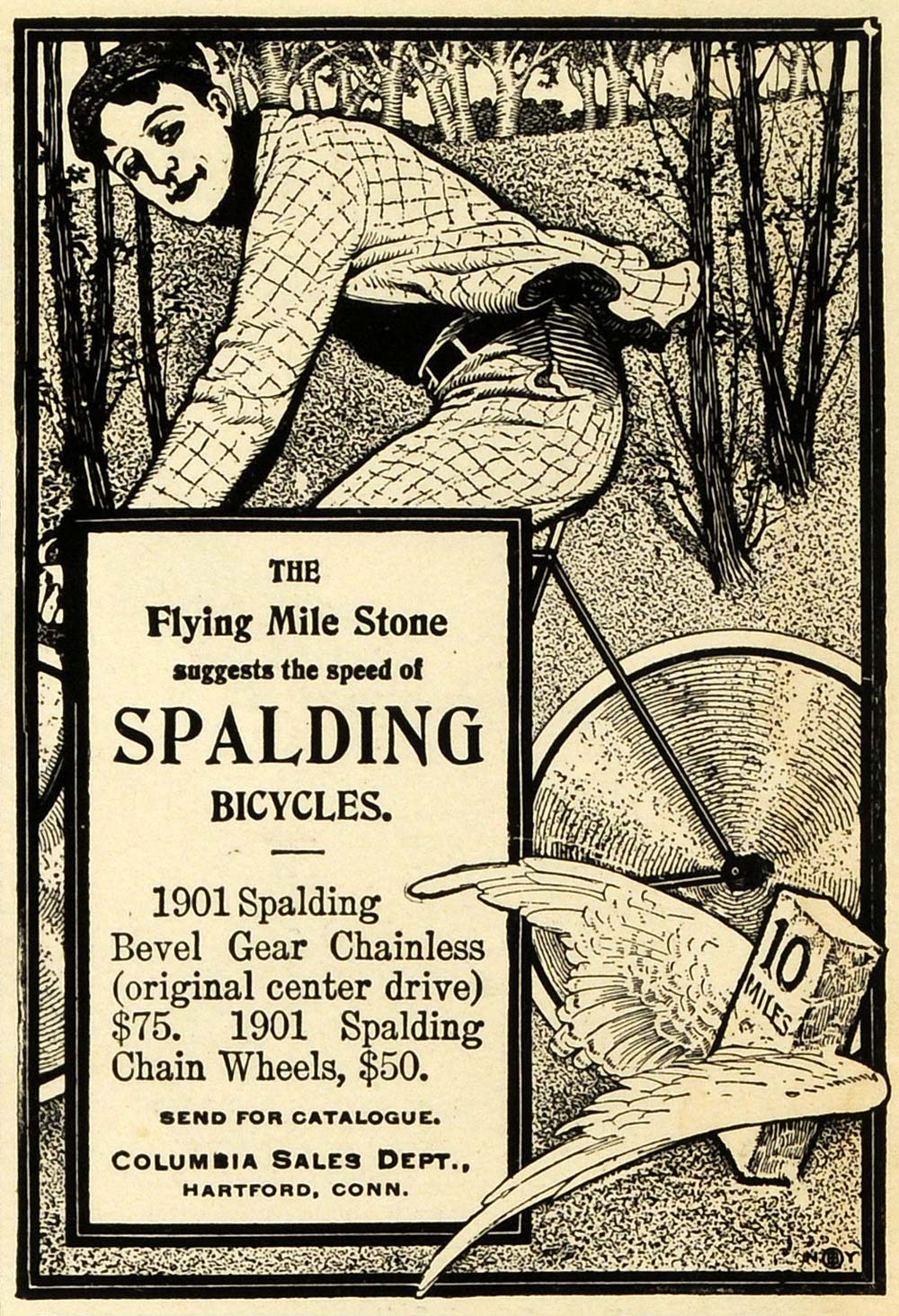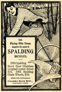 This is an original 1901 black and white print ad for the Flying Mile Stone Spalding Bicycle by the Columbia Sales Department of Hartford, Connecticut.