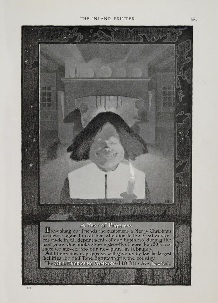 This is an original 1901 black and white print ad from The Gill Engraving Company, 140 Fifth Ave., NYC, wishing the printing industry a "Merry Christmas!"