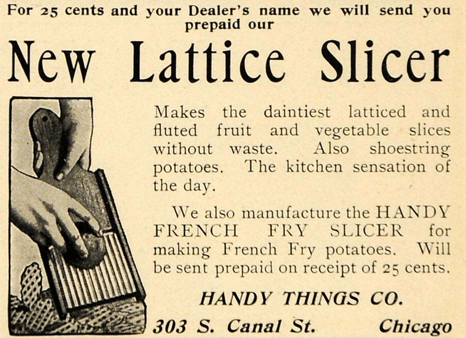 This is an original 1901 black and white print ad for the Handy Things Company, located at 303 S. Canal Street in Chicago, Illinois. This ad features their Lattice Slicer, and this company also offers the Handy French Fry Slicer.