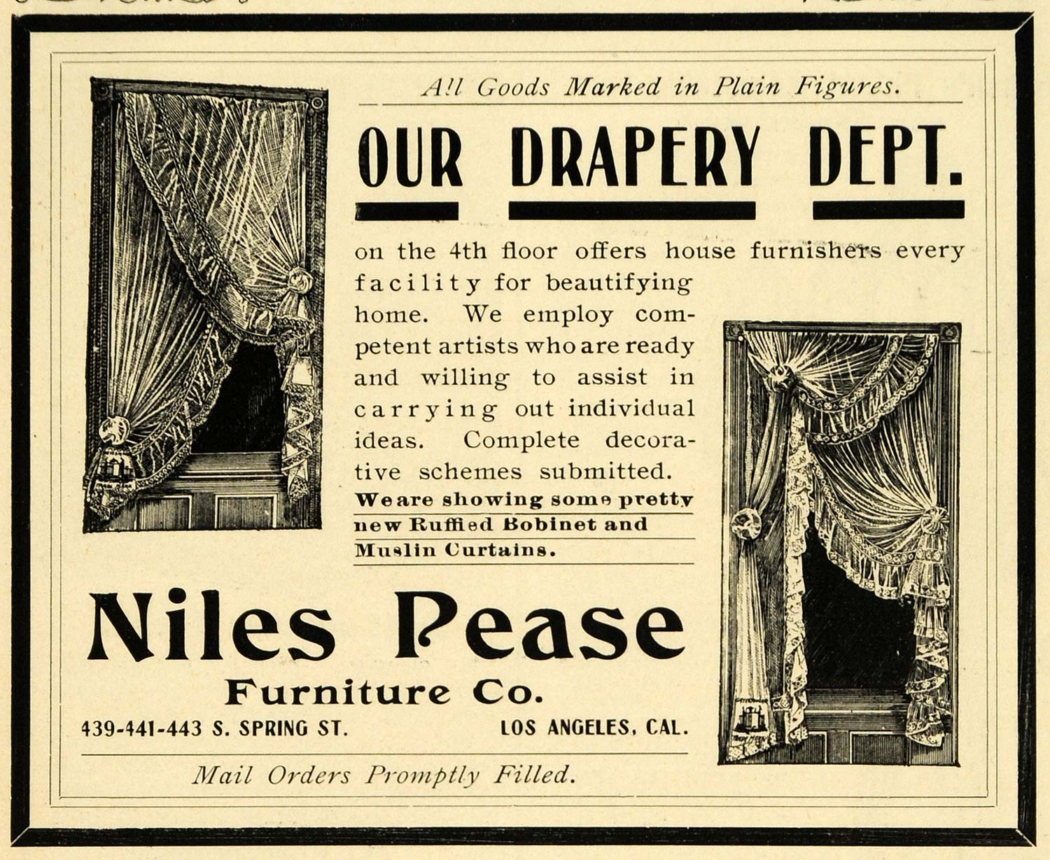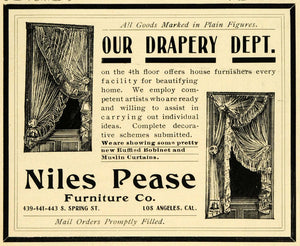 This is an original 1901 black and white print ad for the Niles Pease Furniture Company, located at 439-331-443 South Spring Street in Los Angeles, California. This particular ad is promoting its drapery department.