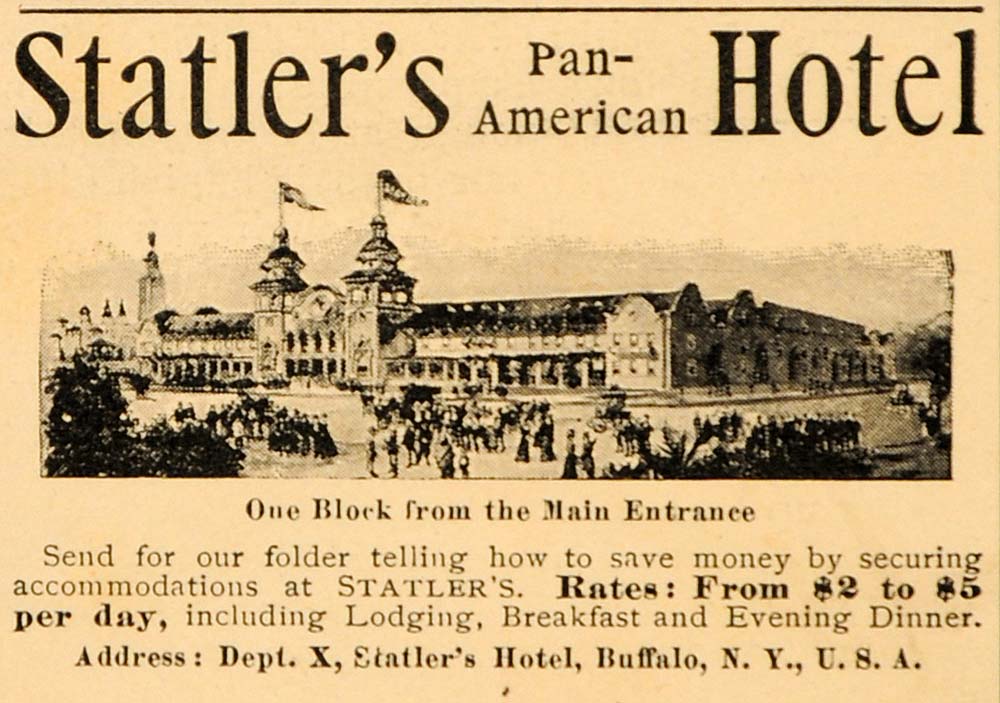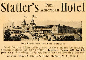 This is an original 1901 black and white print ad for Statler's Pan-American Hotel located at Department X, Statler's Hotel, Buffalo, New York.