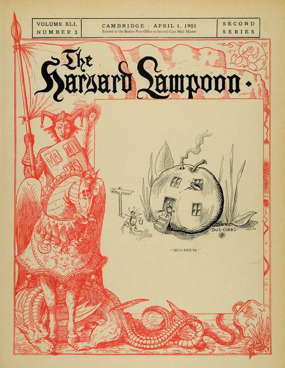 This is an original 1901 two-color cover for the Harvard Lampoon. It features the Lampy the Jester sitting on a winged horse, holding up a shield inscribed with the motto Vanitas (Latin, meaning "empty"), a parody of Harvard's motto, Veritas, or "Truth". The cartoon features a cute bug house.CONDITION