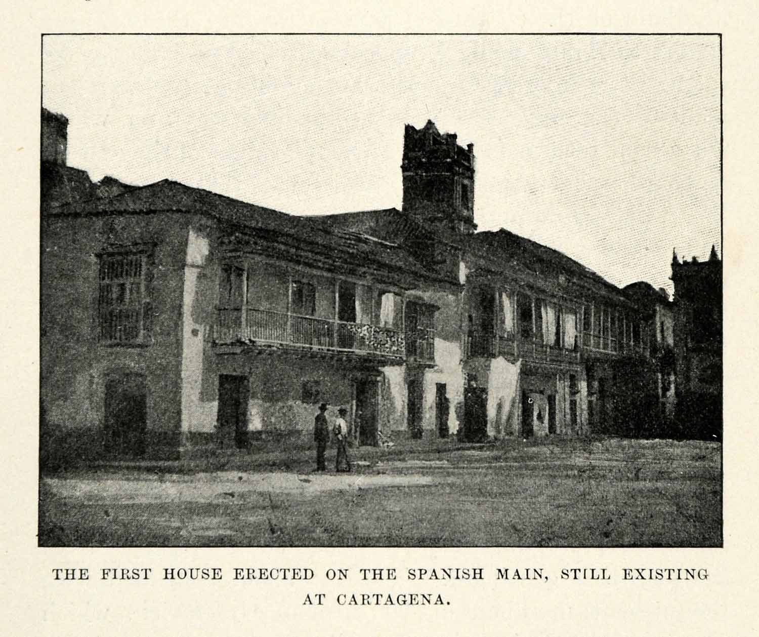 This is an original 1901 black and white halftone print featuring the first house erected on the Spanish main located in the city of Cartagena, Colombia.