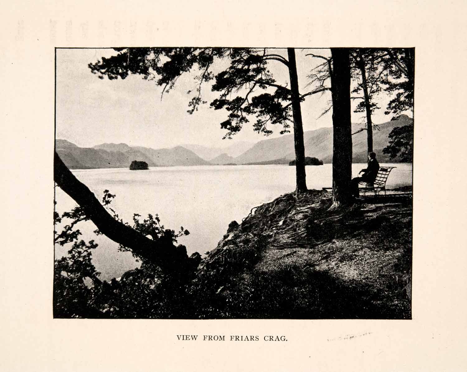 This is an original 1901 black and white halftone print of the view over Derwentwater into the Borrowdale from Friars' Crag where many of the English Lake Poets and artists such as John Ruskin, to whom there is a memorial standing today, drew inspiration in Keswick, England.