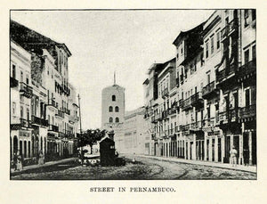 This is an original 1901 black and white halftone print featuring a scene of a street in the state of Pernambuco in Brazil.