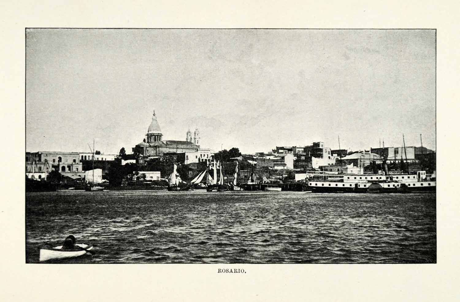 This is an original 1901 black and white halftone print featuring a view of the city of Rosario located on the western shore of the Paraná River, in the province of Santa Fe, Argentina.