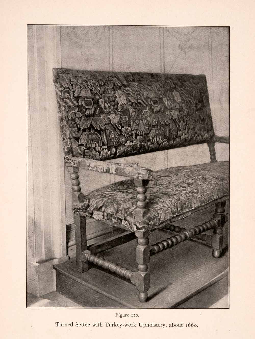 This is an original 1901 black and white halftone print of a turned settee with Turkish upholstery built around 1660.