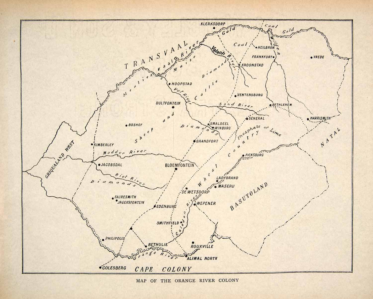 Keywords specific to this image: Cape Colony, Basutoland, Natal, Colesberg, Aliwal North, Rouxville, Smithfield, Wepener, Philipolis, Colesberg, Fauresmith, Jagersfontein, Kimberly, Hoopstad, Valsch River, Kroonstad, Frankfort, Heilbron, Klerksdorp