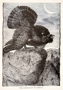 This is an original 1901 black and white relief line-block print of the Capercailzie (Capercaillie) in Norway.