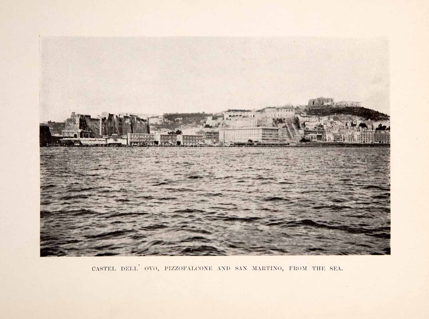 This is an original 1901 black and white halftone print of the "Castel Dell' Ovo, Pizzofalcone and San Martino, From the Sea," in Italy.