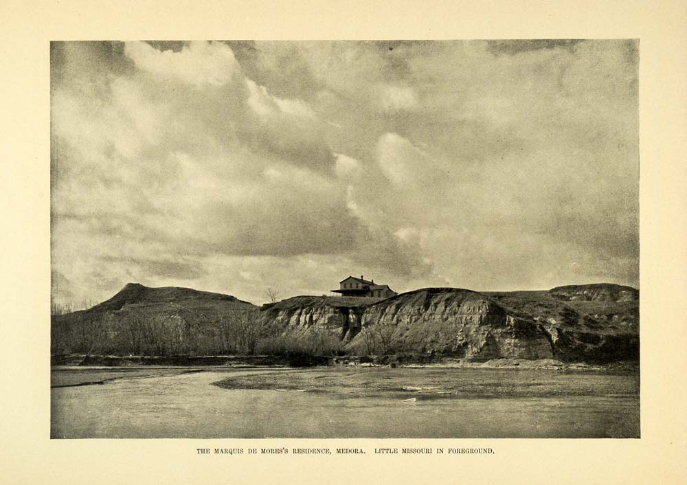 This is an original 1901 halftone print of the Chateau de Mores in Medora, North Dakota. The historic home was built by its owner, French aristocrat and entrepreneur Marquis de Mores in 1883, and was meant to serve family and friends as a hunting lodge and summer home. The historic home was named after Mores' wife, Medora. Today, the mansion has been turned into a public museum and operates under the direction of the State Historical Society of North Dakota.