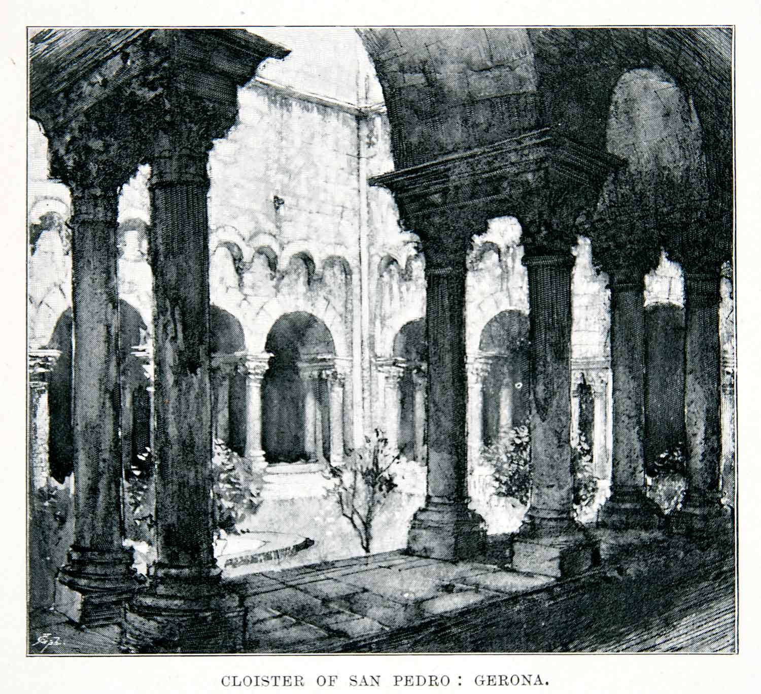 This is an original 1901 black and white halftone print of the cloister of San Pedro in Girona, Catalonia, Spain.
