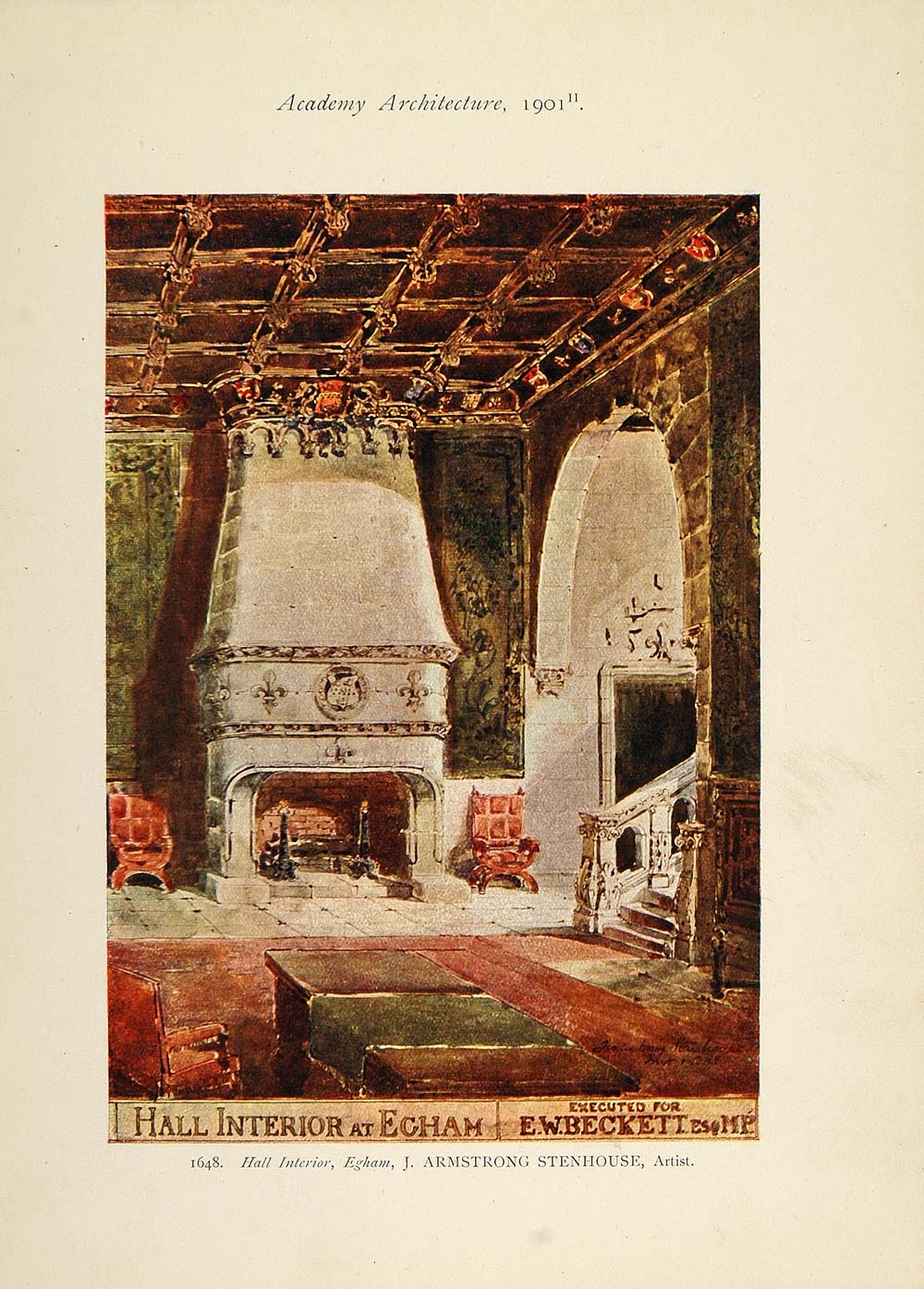 This is an original 1901 color print of a painting by J. Armstrong Stenhouse of the interior hall of the home of E. W. Beckett in Egham, Surrey, England.