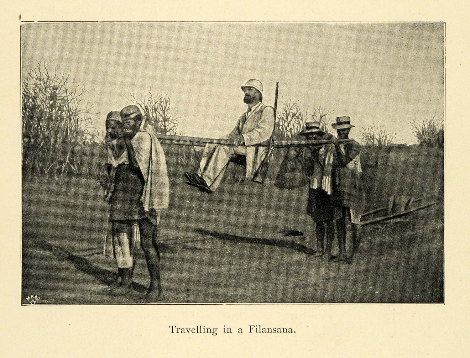 This is an original 1901 halftone print of natives of Filansana, Madagascar carrying a man via litter.