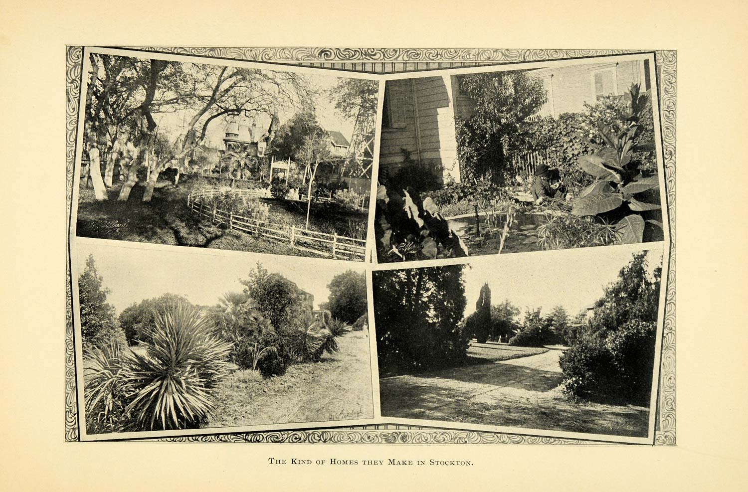 This is an original 1901 halftone print of some quaint homes and gardens in Stockton, California, of San Joaquin County.