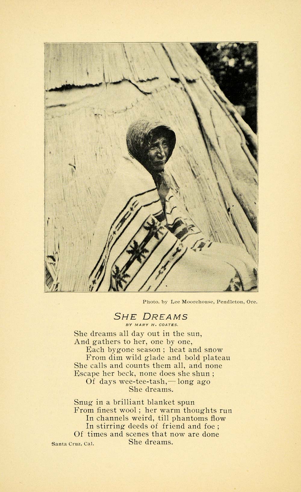 This is an original 1901 halftone print of a native woman of California and a poem entitled "She Dreams" by the author Mary H. Coates.