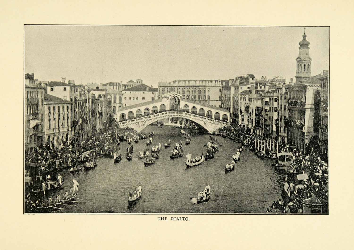 This is an original 1901 halftone print of the Rialto, the business district of Venice, Italy. It is also the name of the bridge crossing the Grand Canal that connects the Rialto with the rest of Venice.