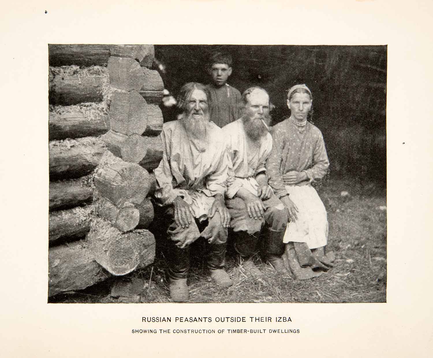 This is an original 1901 black and white halftone print of Russian Peasants outside of their Izba, which is a timber-built dwelling, that rarely uses nails for the construction.