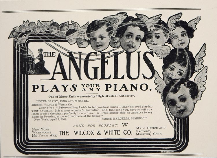 This is an original 1901 black and white print ad for the Angelus Player Piano from The Wilcox & White Company, 164 Fifth Ave., NYC, with a testimonial from Marcella Sembrich.