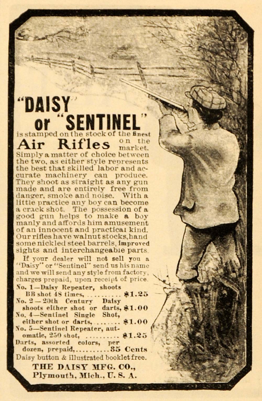 This is an original 1901 black and white print ad for the Daisy or Sentinel Air Rifles from The Daisy Mfg. Co. of Plymouth, Michigan.