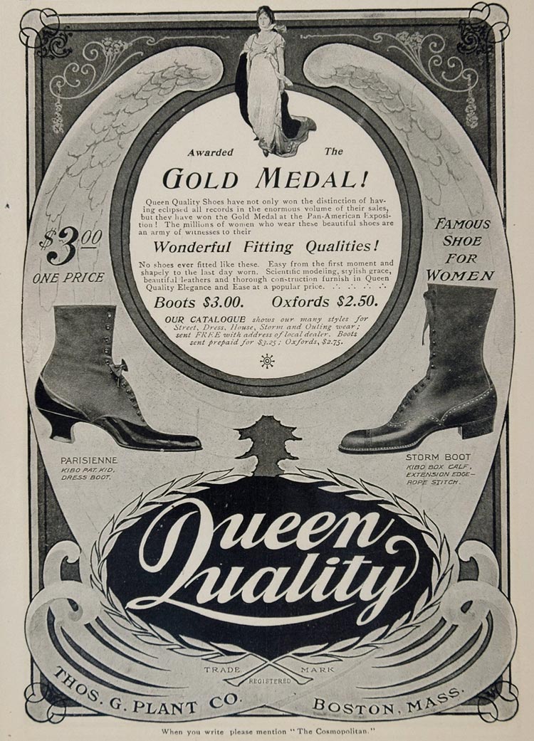 This is an original 1901 black and white print ad for Queen Quality women's shoes and boots from the Thos. G. Plant Co., Boston. Pictured are the "Parisienne," dress boot and the "Storm Boot." Queen Quality Shoes won the Gold Medal at the Pan-American Exposition.