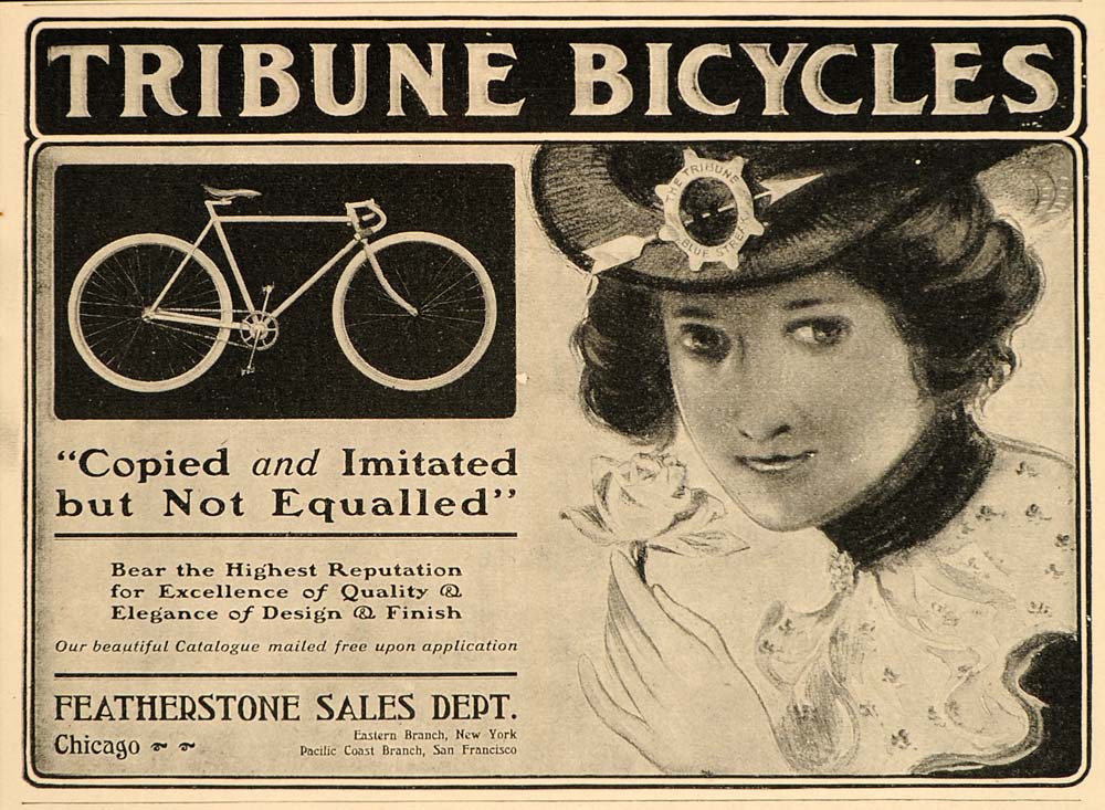 This is an original 1901 black and white print ad for Tribune Bicycles from the Featherstone Sales Dept., Chicago.