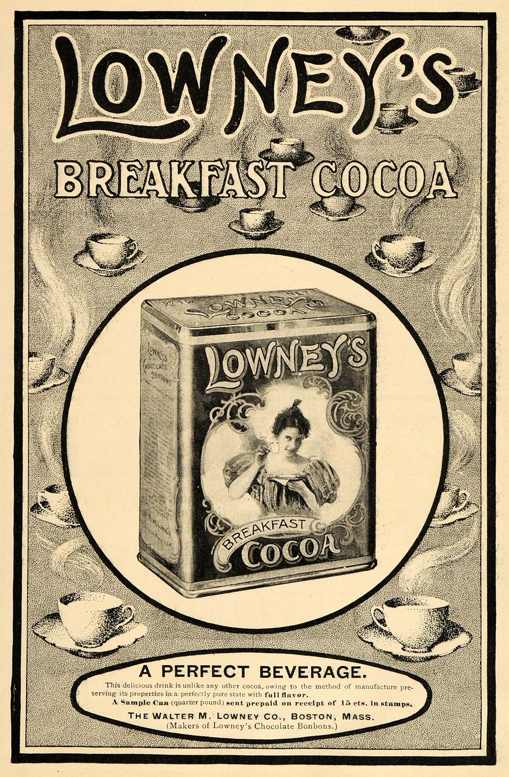 This is an original 1901 black and white print ad for Lowney's Breakfast Cocoa from The Walter M. Lowney Co., Boston.