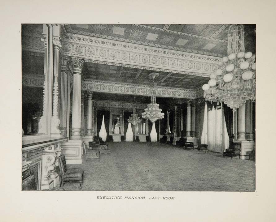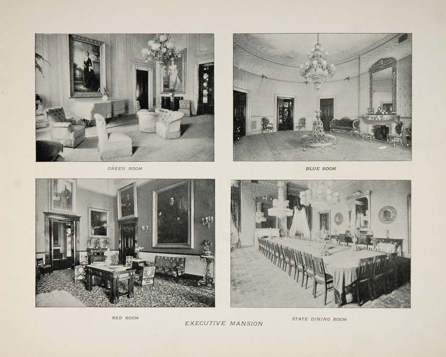 This is a double-sided print. On the reverse: Executive Mansion: Green Room, Red Room, Blue Room, State Dining Room. (These four images measure approx. 3 x 4 inches each.)