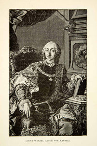 This is an original 1901 monochrome in-text wood engraving of a portrait of Count Wenzel Anton Von Kaunitz who was a diplomat and statesman of the Holy Roman Empire.