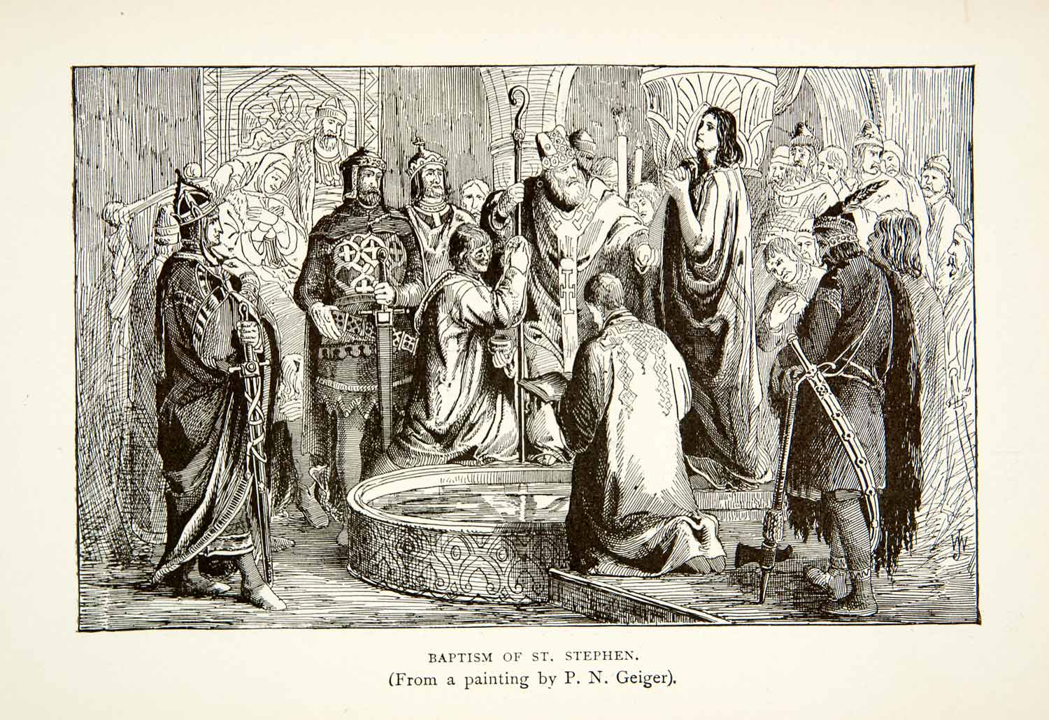 This is an original 1901 black and white in-text wood engraving of the baptism of King Vajk of Hungary. He was a member of the Orthodox Christian church and changed his name to Stephen I. A state holiday is celebrated in his honor even today.