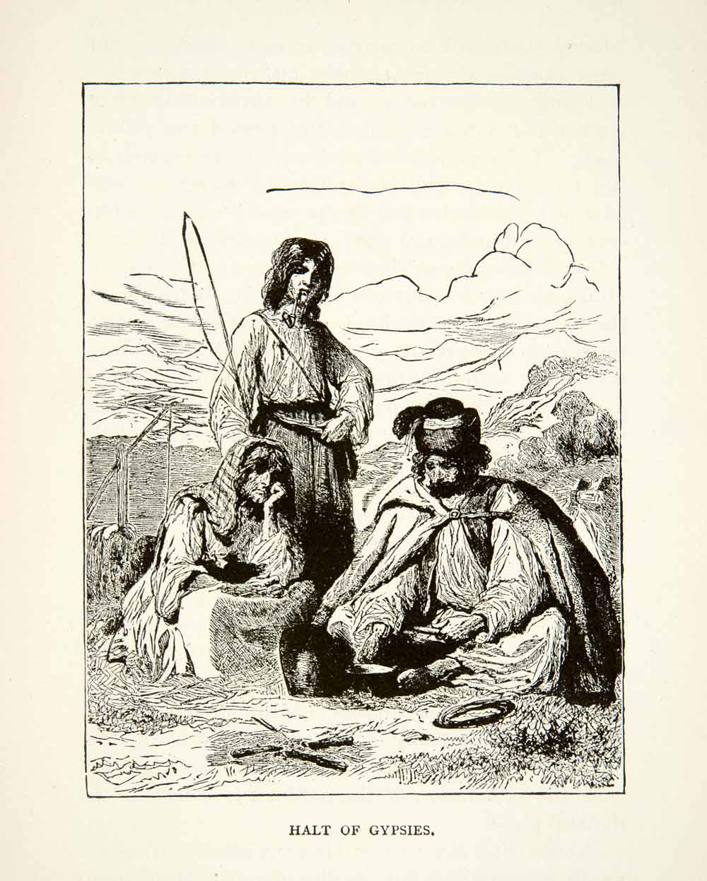 1901 Wood Engraving Camp Picnic Gypsy Costume Ethnic Art Fire Cook Pipe XEE2