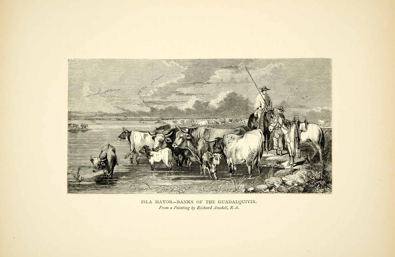 This is an original circa 1901 black and white wood engraving of a painting by Richard Ansdell (1815-1885) that depicted peasant ranchers with their cattle herds along the banks of the Guadalquivir River near Isla Mayor, Spain, Europe.