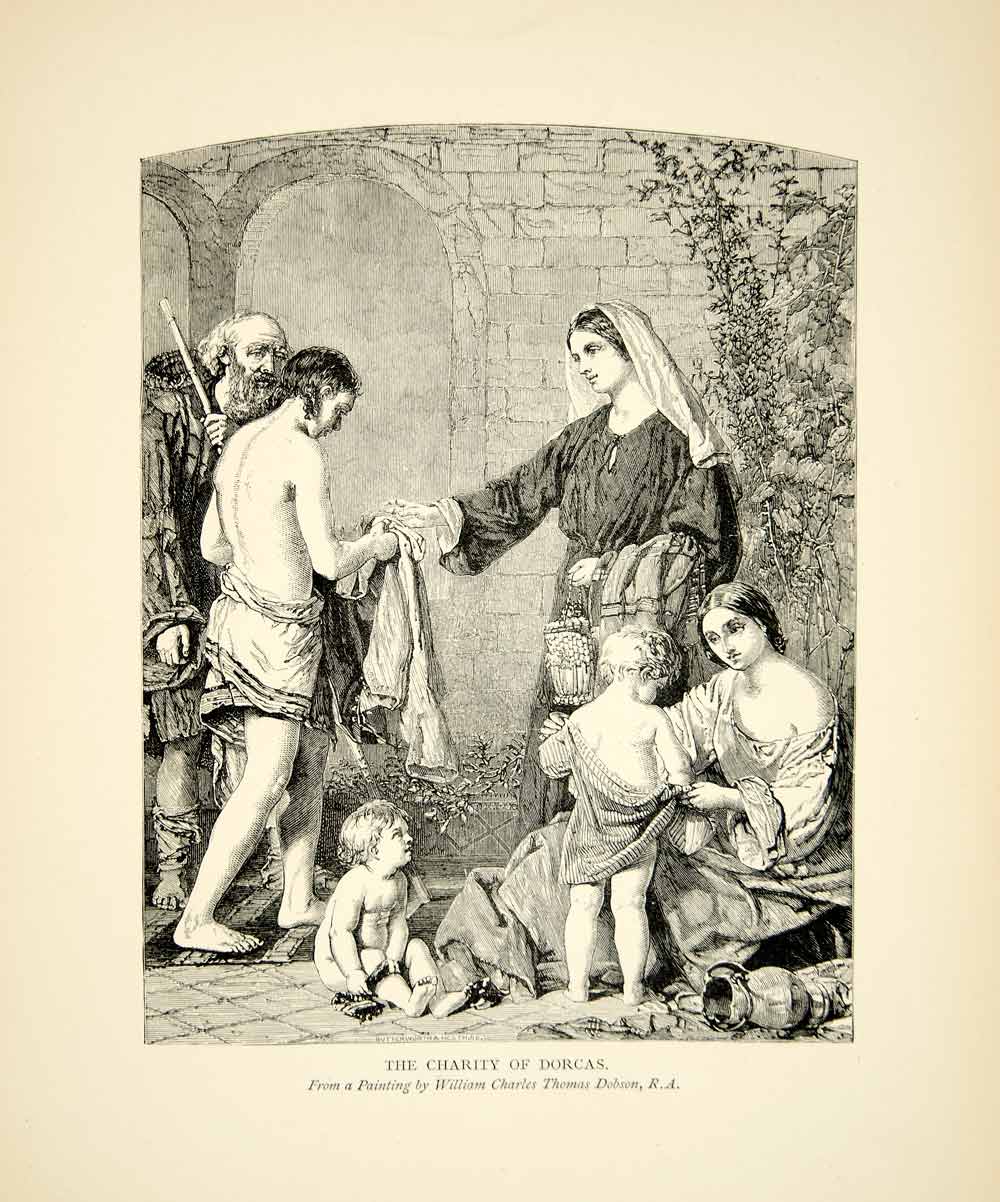 This is an original circa 1901 black and white wood engraving of a painting by William Charles Thomas Dobson (1817-1898) entitled "The Charity of Dorcas" that portrayed the Christian disciple Dorcas (Tabitha) providing the poor and needy with clothing.