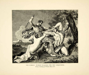 This is an original circa 1901 black and white wood engraving of a painting by William Etty (1787-1849) entitled "The Combat: Woman Pleading for the Vanquished" that portrayed a woman begging for the life of a defeated warrior.