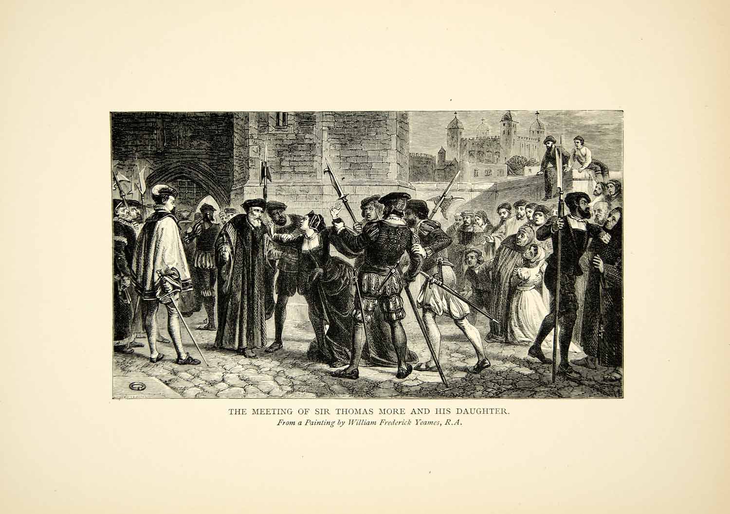 This is an original circa 1901 black and white wood engraving of a painting by William Frederick Yeames (1835-1918) entitled "The Meeting of Thomas More with His Daughter after His Sentence of Death". Sir Thomas More (1478-1535) was a Roman Catholic lawyer, author, and philosopher who openly opposed the Protestant Reformation and King Henry VIII's annulment from Catherine of Aragon. He was tried for treason and executed on July 6, 1535.