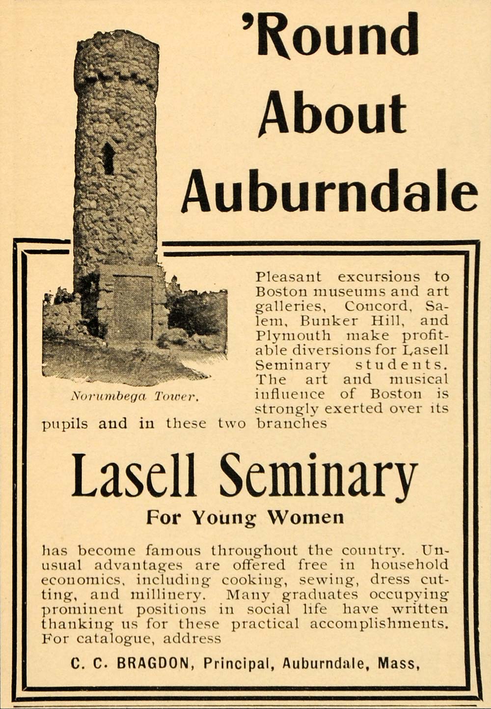 This is an original 1902 black and white print ad for Lasell Seminary for Young Women by C. C. Bragdon (Principal) located in Auburndale, Massachusetts.