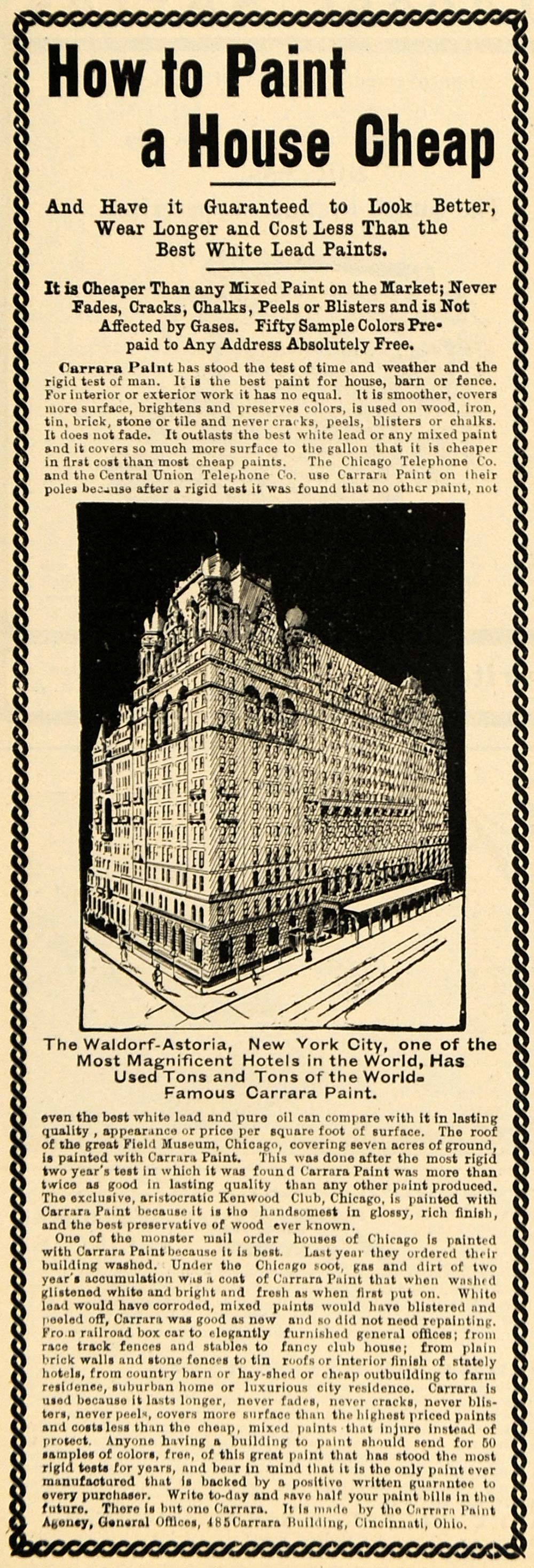 This is an original 1902 black and white print ad for the Carrara Paint from Carrara Paint Agency located in Cincinnati, Ohio.