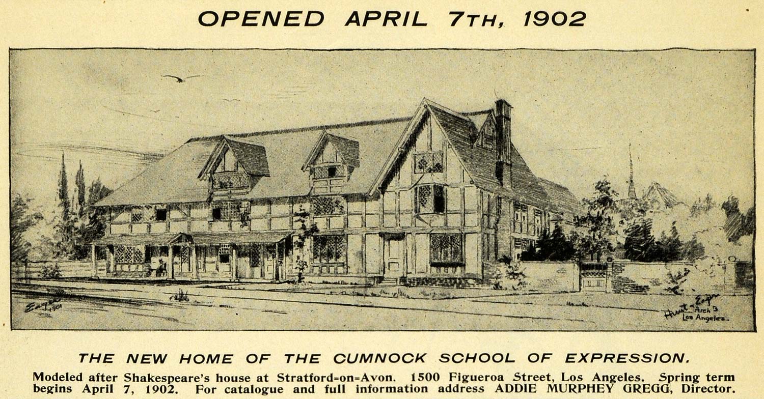 This is a small ultra rare important historical original 1902 black and white print ad for the Cumnock School of Expression in Los Angeles, California, led under the direction of Addie Murphey Gregg. The architecture of this school was modeled after Shakespeare's home at Stratford-on-Avon. This school, which opened in 1894 under Mrs. Merrill Moore Grigg, was named after Dr. Robert McLean Cumnock, a literature interpreter, as well as the head of the School of Oratory at Northwestern University. In 1928, the school became coeducational.